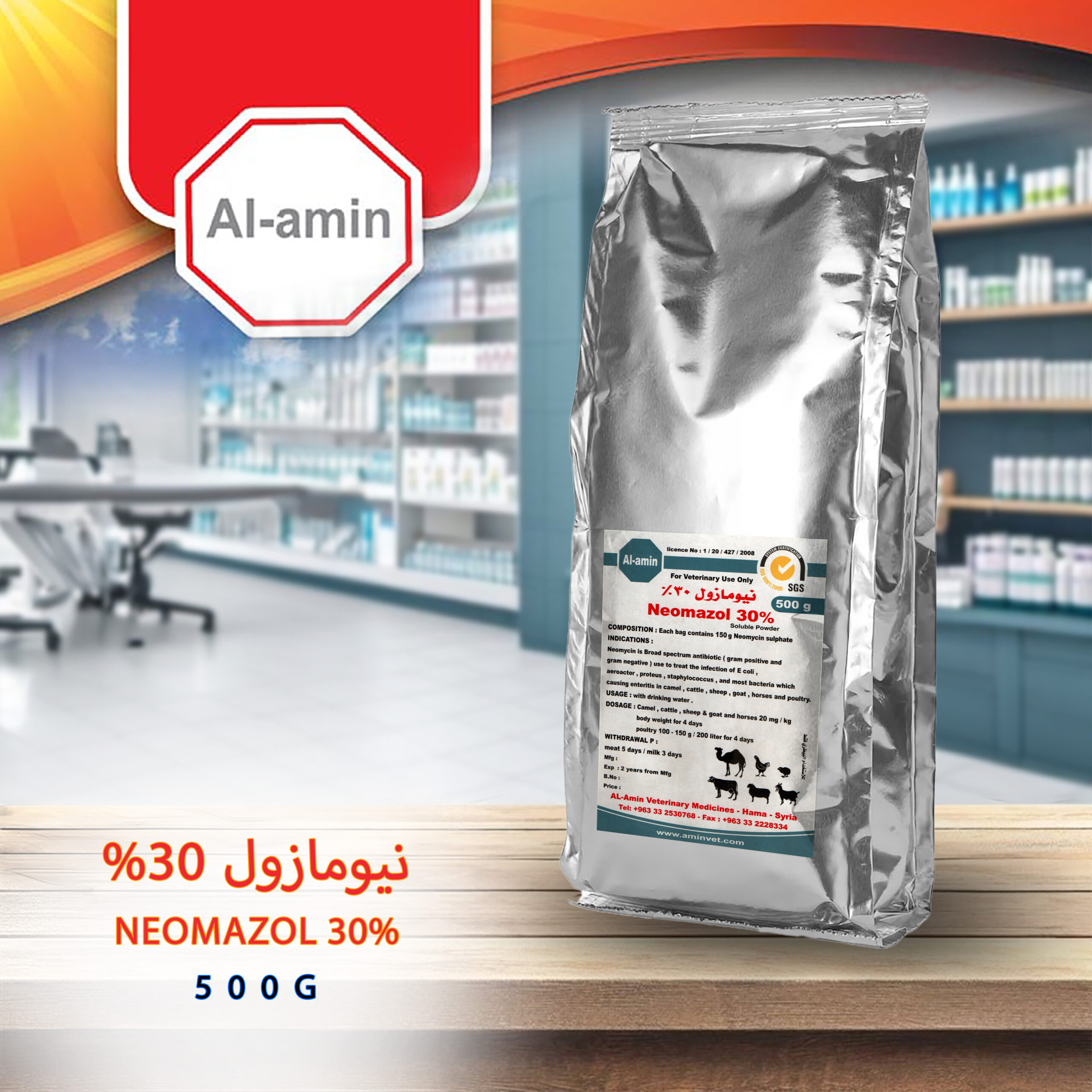 نيومايسين مضاد حيوي ينتمي لمجموعة أمينوجليكوسيدات وله تأثير قاتل للبكتيريا ويؤثر بشكل أساسي على الجراثيم سلبية الغرام : إيكولاي ، كليبسيلا ، باستوريلا ، سالمونيلا ، المكورات العنقودية .